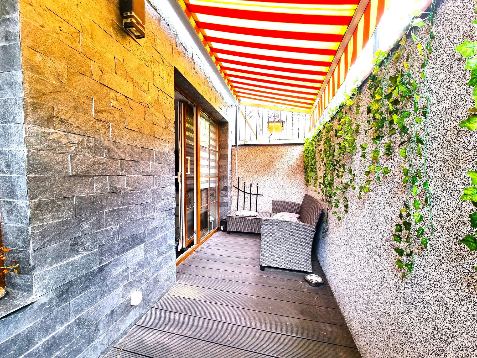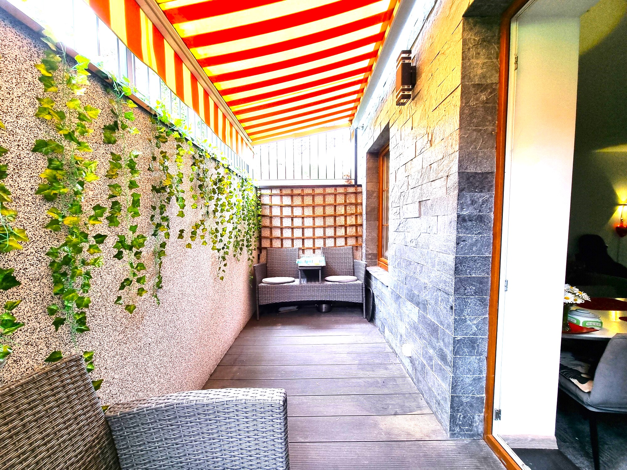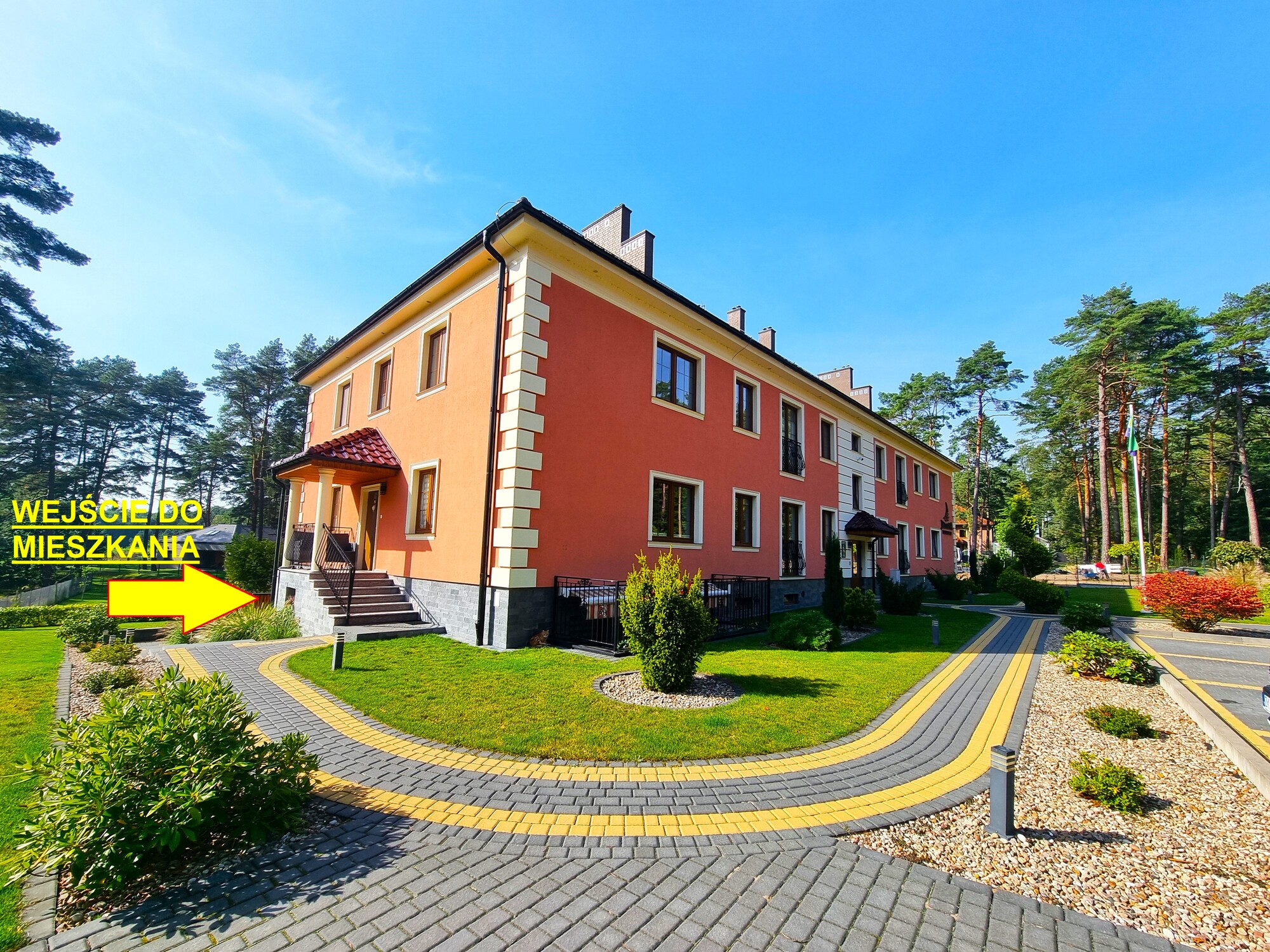 Budynek, w którym znajduje się mieszkanie, to typowy „koszarowiec”, zapewniający spokój i prywatność. Mieszkanie posiada osobne, niezależne wejście, co dodatkowo podnosi komfort mieszkańców. Wejście do mieszkania prowadzi na przestronny balkon, który w połowie jest zasłonięty, a w drugiej części – odkryty, co daje możliwość korzystania z różnorodnych warunków atmosferycznych. Zainstalowana moskitiera chroni przed niechcianymi owadami, co jest szczególnie przydatne w ciepłych miesiącach. Przed wejściem do mieszkania znajduje się dodatkowa przestrzeń przeznaczona do wypoczynku, idealna na relaks na świeżym powietrzu – miejsce na 4 osoby, które stanowi kolejny atut tej nieruchomości.
