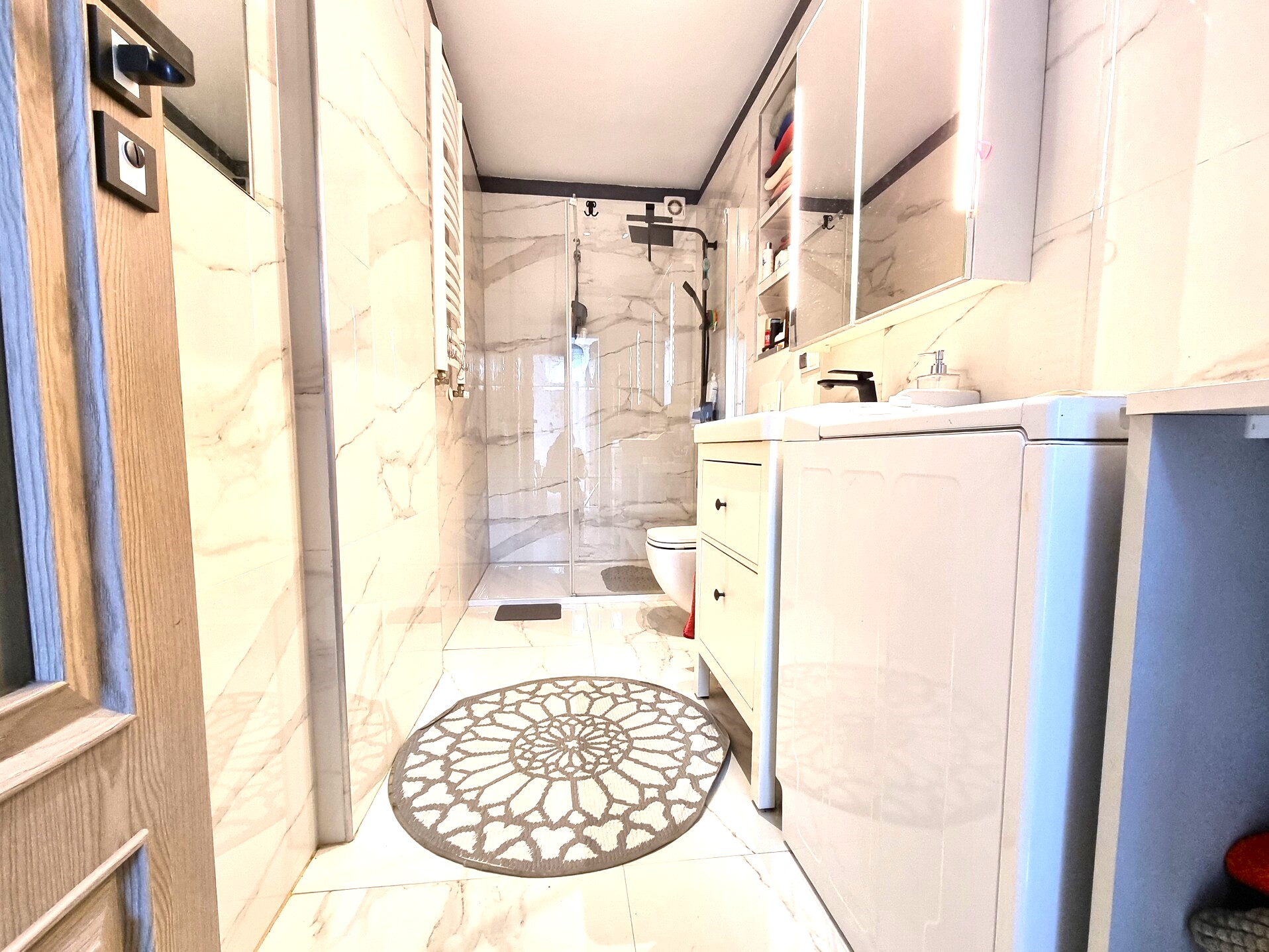 Łazienka to kolejny przykład przemyślanej aranżacji. Znajduje się tutaj nowoczesna glazura i terakota, które tworzą elegancką, ale i funkcjonalną przestrzeń. Prysznic z odpływem liniowym to rozwiązanie, które nadaje łazience współczesnego charakteru, jednocześnie ułatwiając utrzymanie czystości. Muszla WC jest podwieszana, co również wpływa na estetykę wnętrza i ułatwia sprzątanie. W łazience znajduje się również podświetlane lustro z szafką, które nie tylko pełni funkcję praktyczną, ale także stanowi element dekoracyjny. Umywalka z szafką i wbudowane półki zapewniają dodatkową przestrzeń do przechowywania, co jest szczególnie ważne w mniejszych łazienkach.