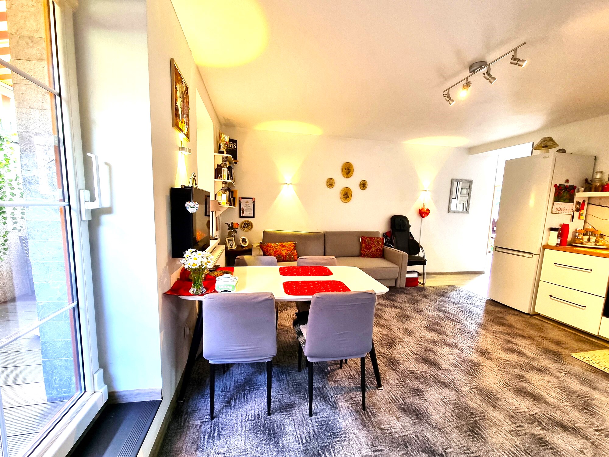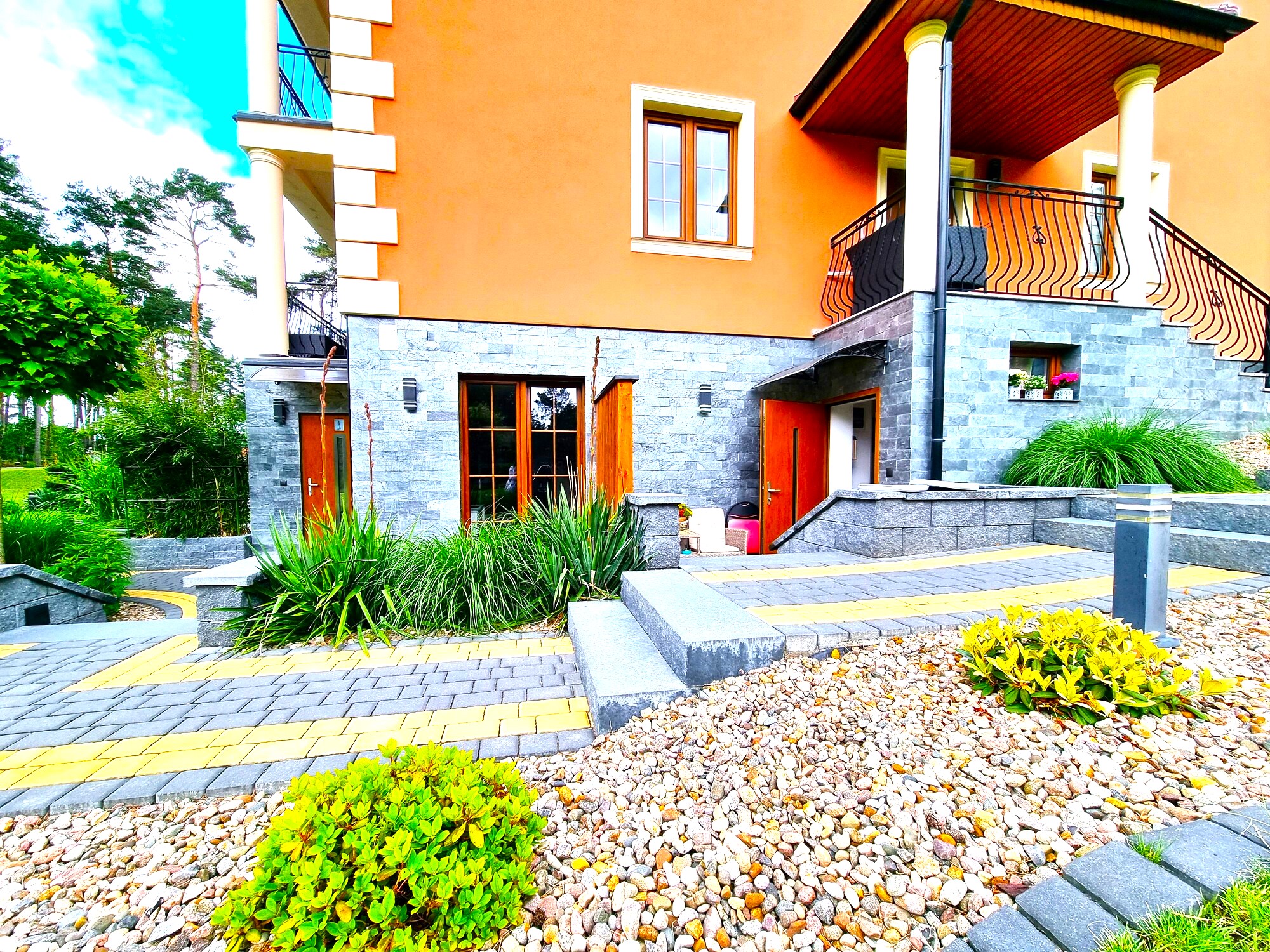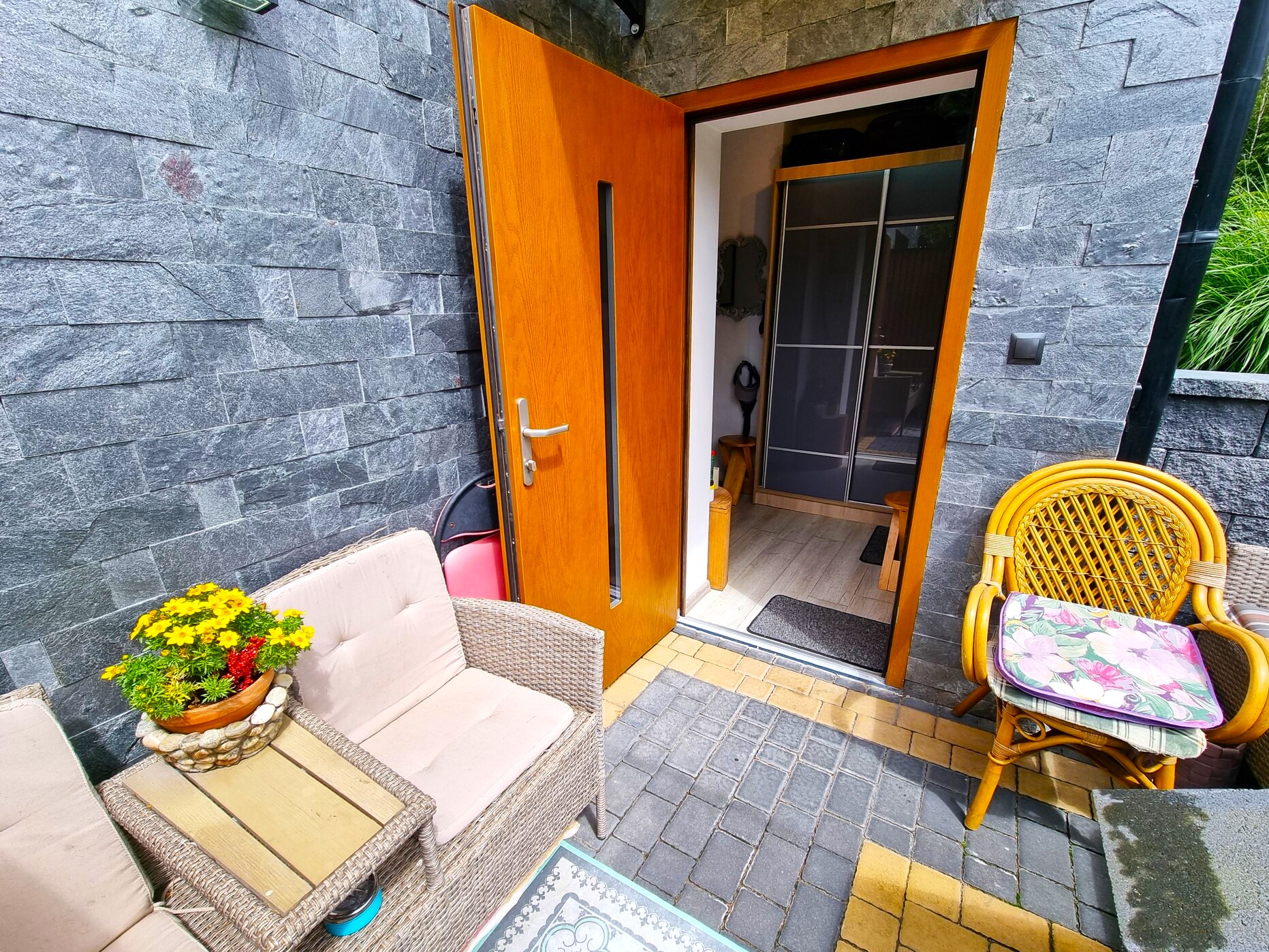 Dodatkowe miejsce do wypoczynku przed wejściem do mieszkania stanowi idealną przestrzeń na spotkania towarzyskie na świeżym powietrzu. Jest to także doskonała opcja dla osób, które chcą cieszyć się spokojem, czytając książkę lub pijąc poranną kawę w otoczeniu natury.