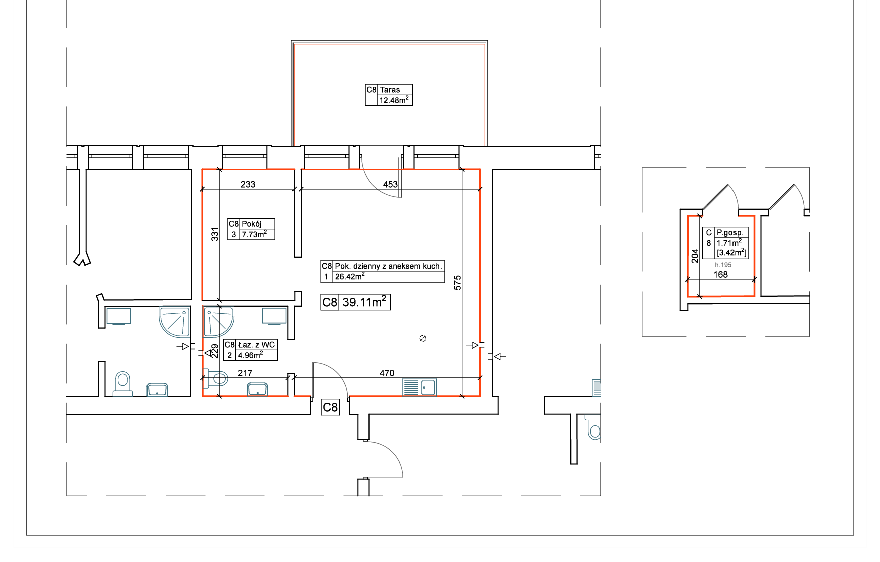 - Taras – 12,48 m² – idealny na poranną kawę, wieczorne rozmowy lub odpoczynek na świeżym powietrzu.