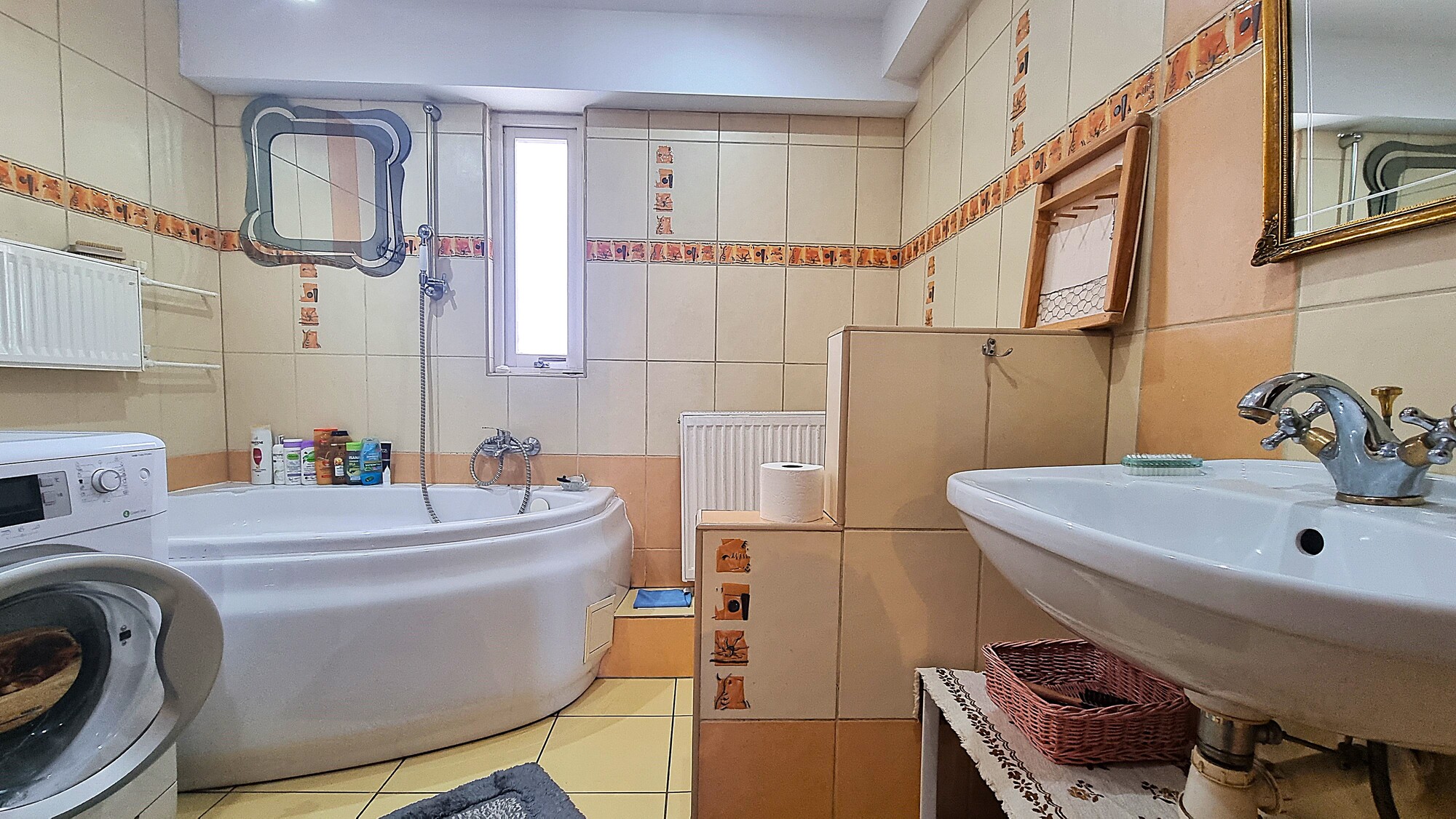 - Wyposażenie: narożna wanna, muszla WC, umywalka, pralka