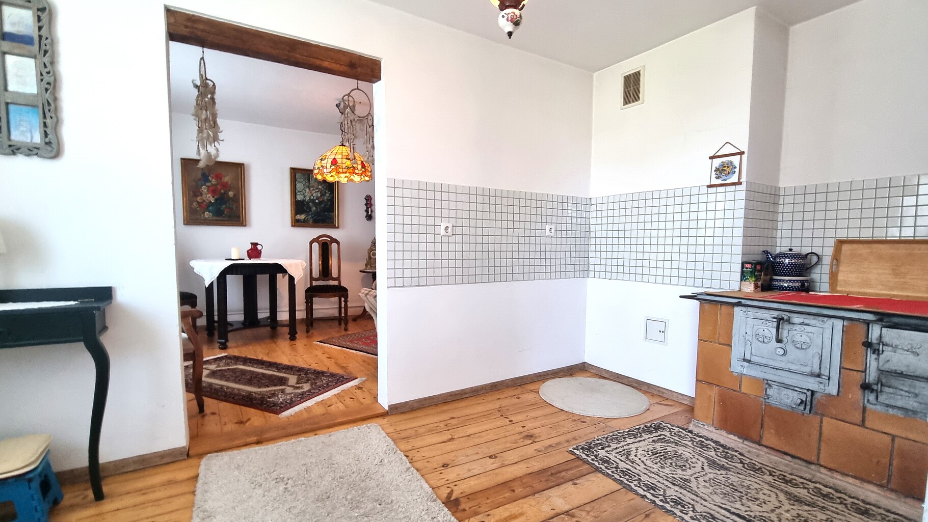 - Kuchnia: bez mebli, wyposażona w piecyk typu westfalka