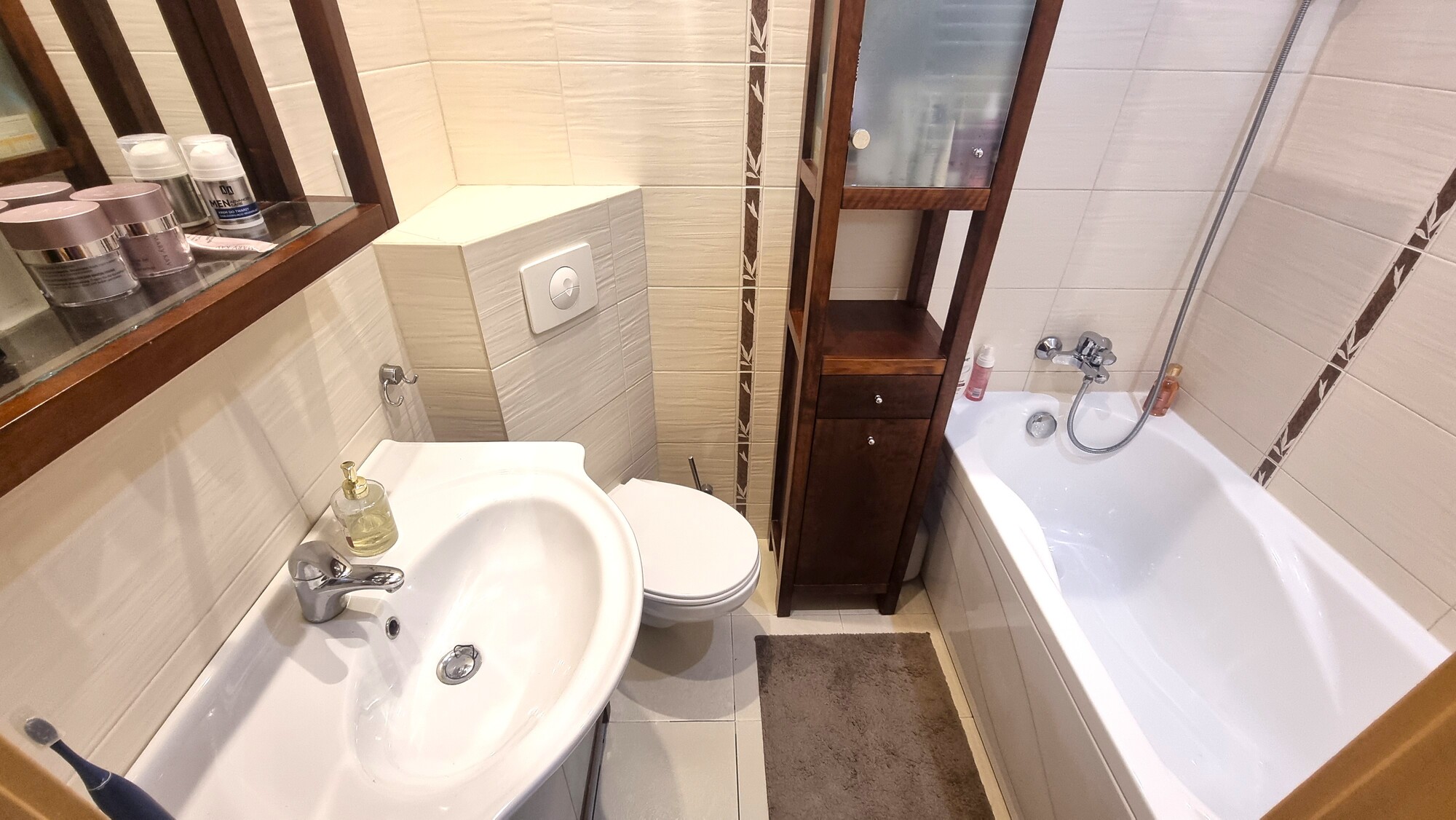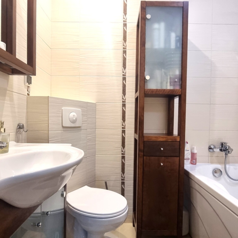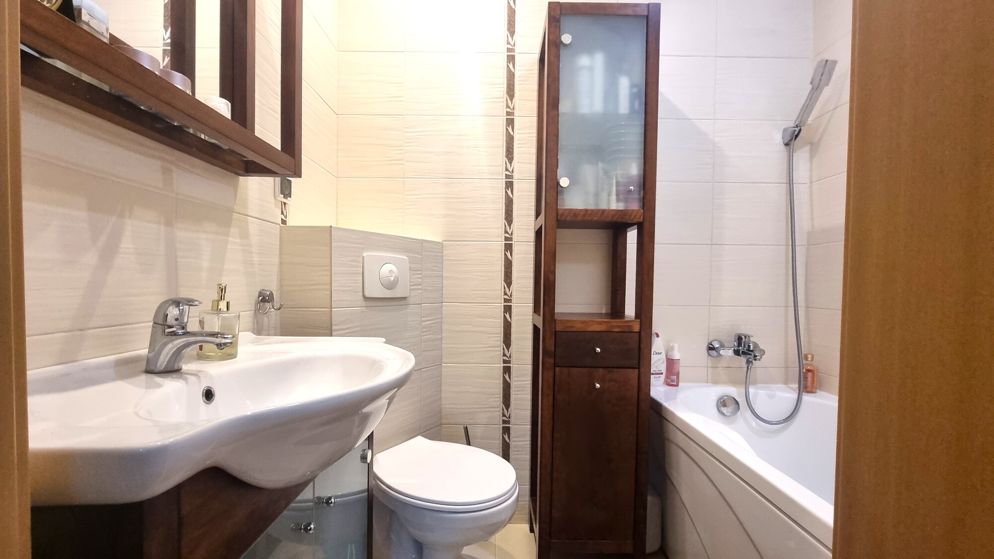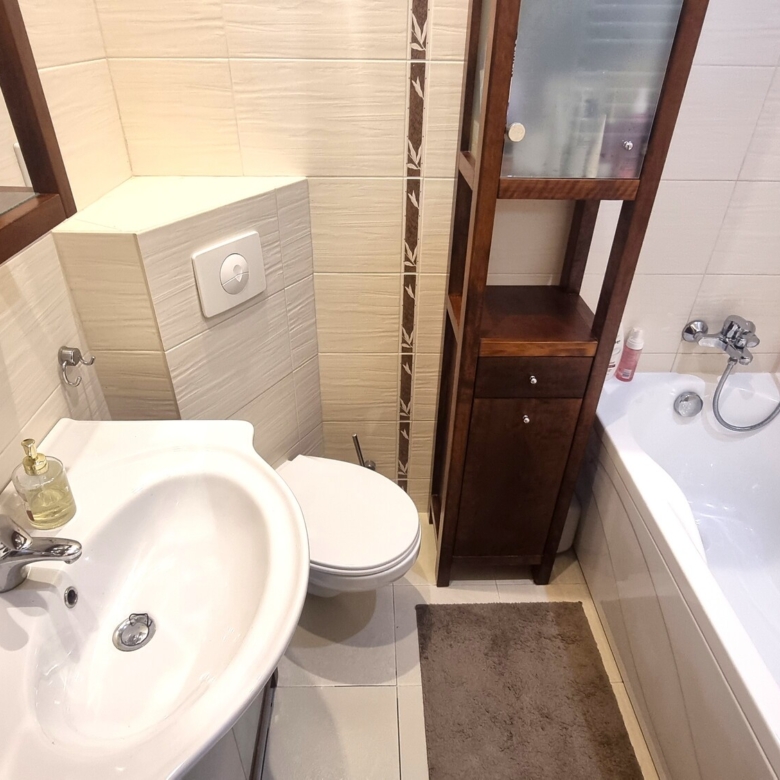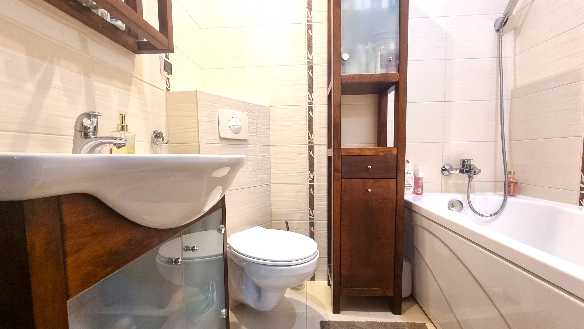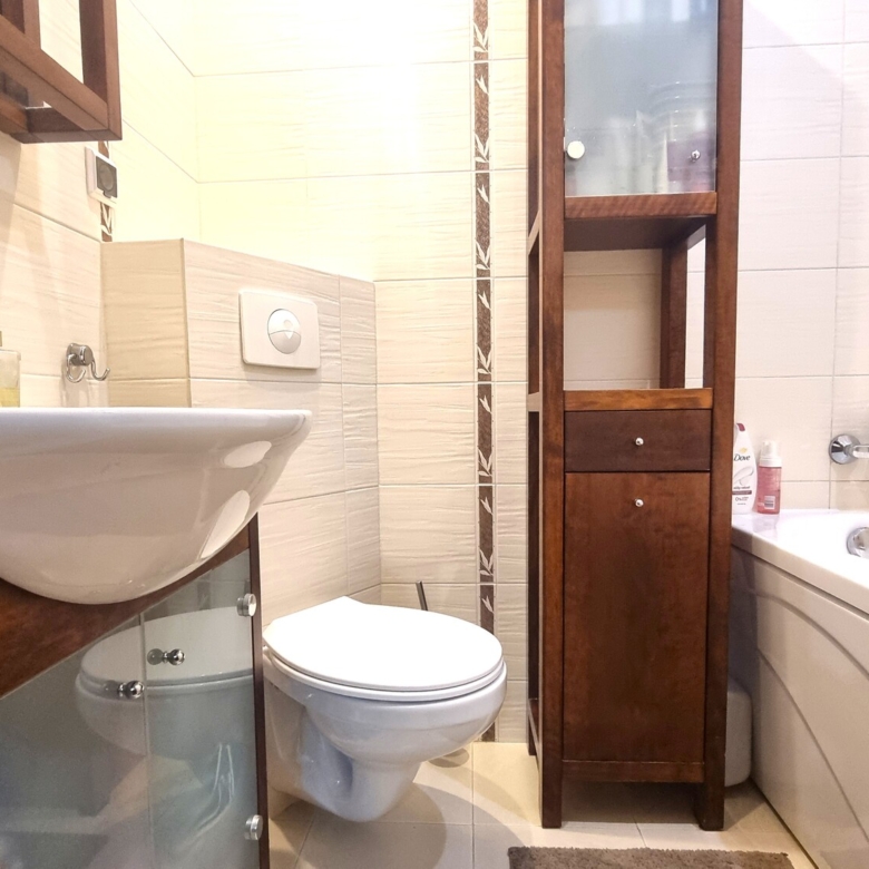 – Łazienka z WC, wyposażona w: wannę, umywalkę z szafką i lustrem, toaletę.