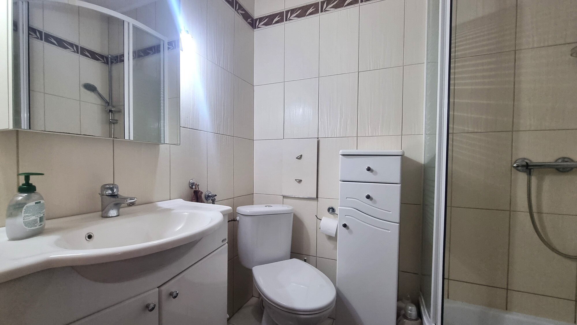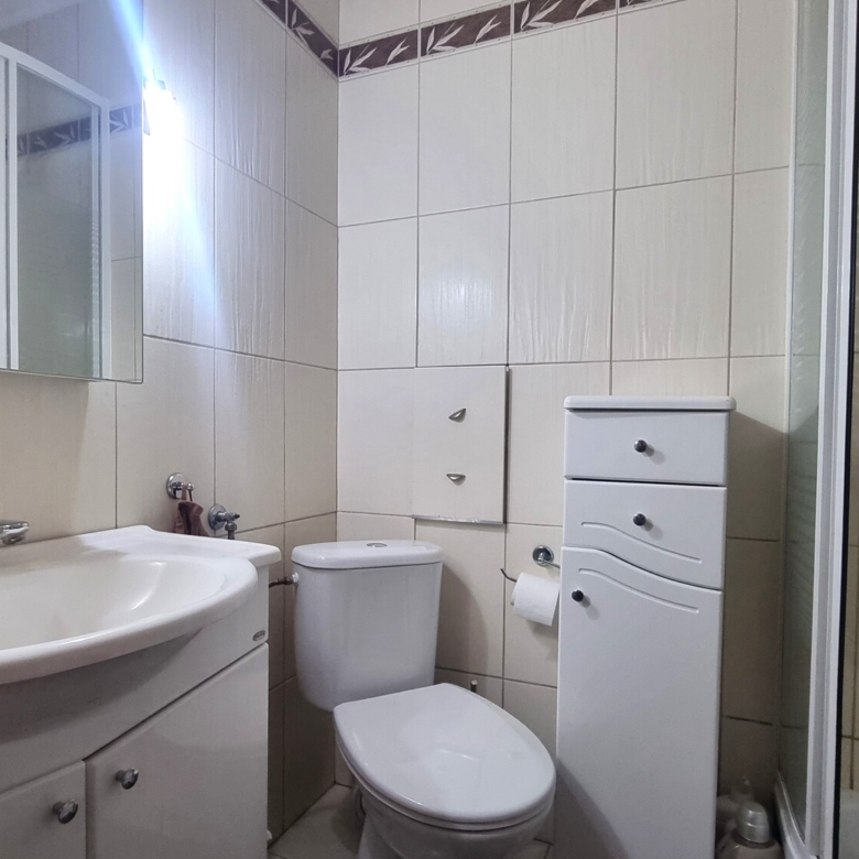 – Łazienka z WC, wyposażona w: prysznic, umywalkę z szafką i lustrem, toaletę.