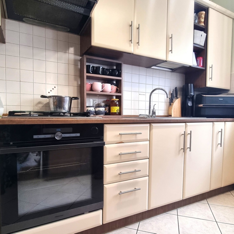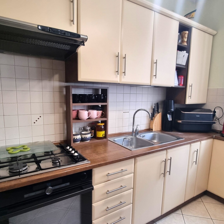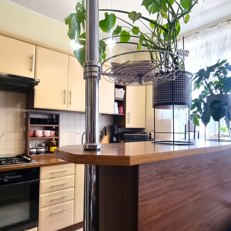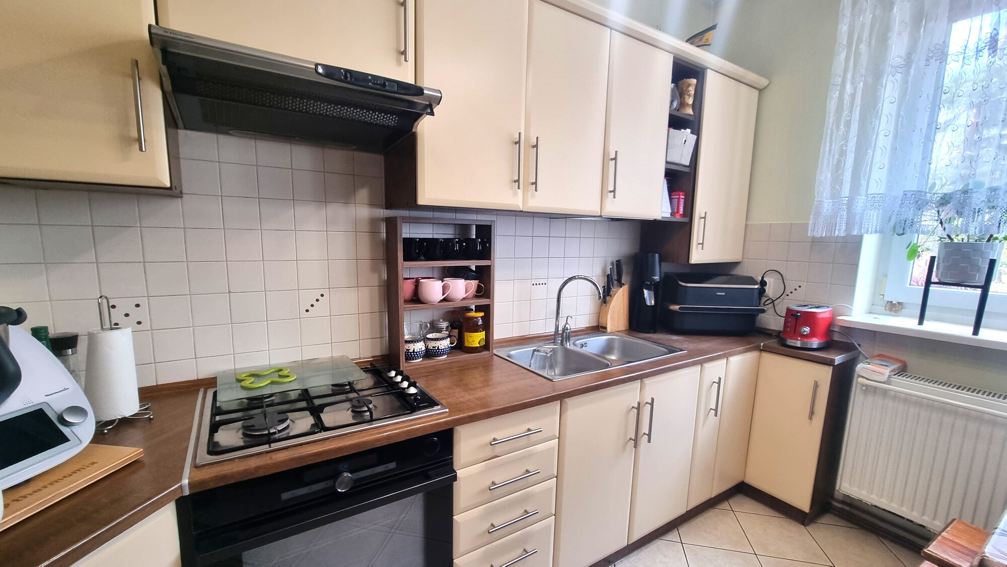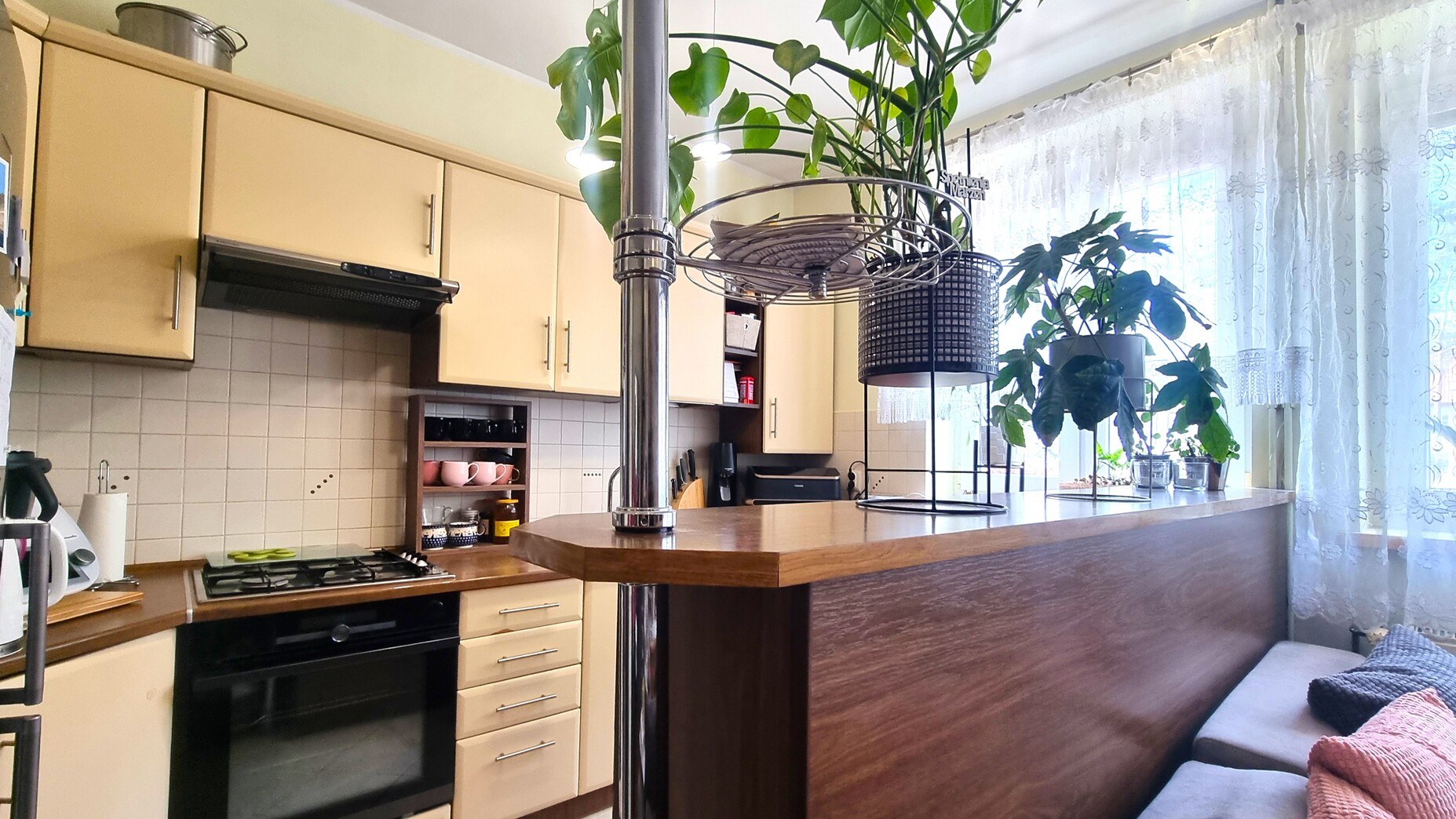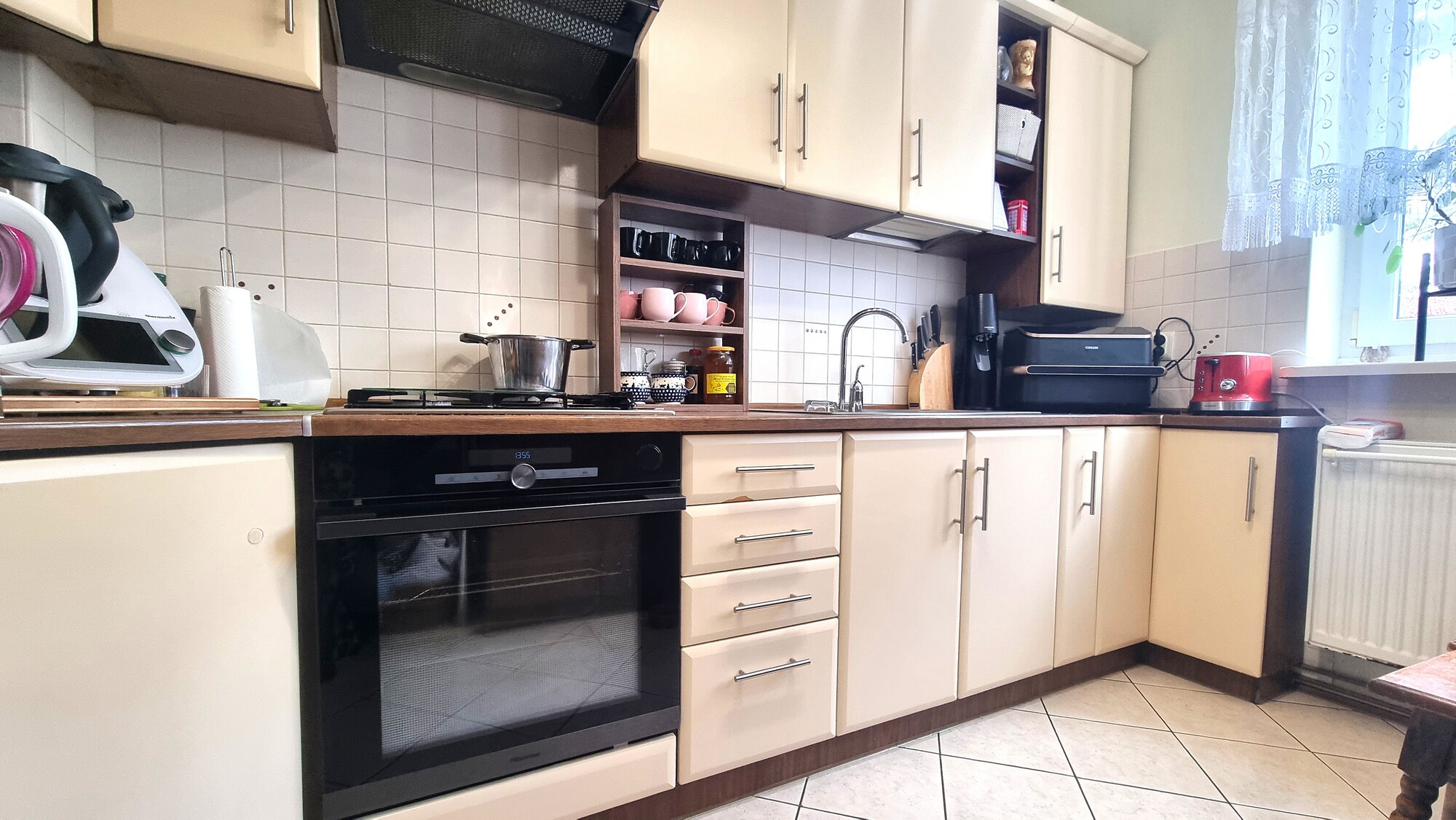 – Aneks kuchenny wyposażony jest w zabudowę meblową, płytę gazową oraz funkcjonalną wysepkę, która zwiększa komfort użytkowania i daje dodatkową przestrzeń roboczą.