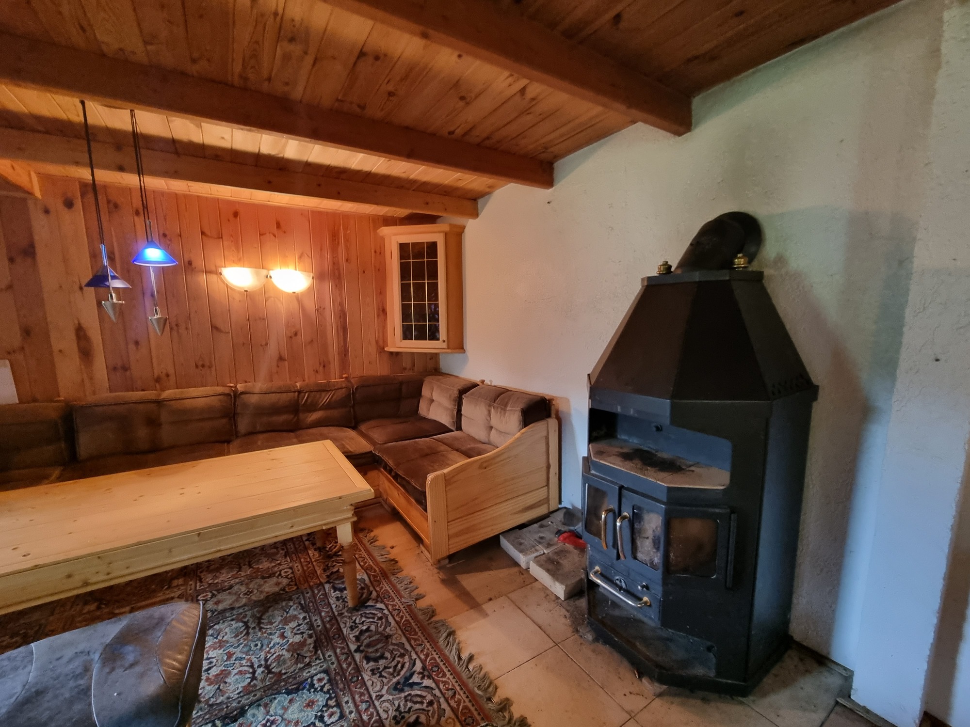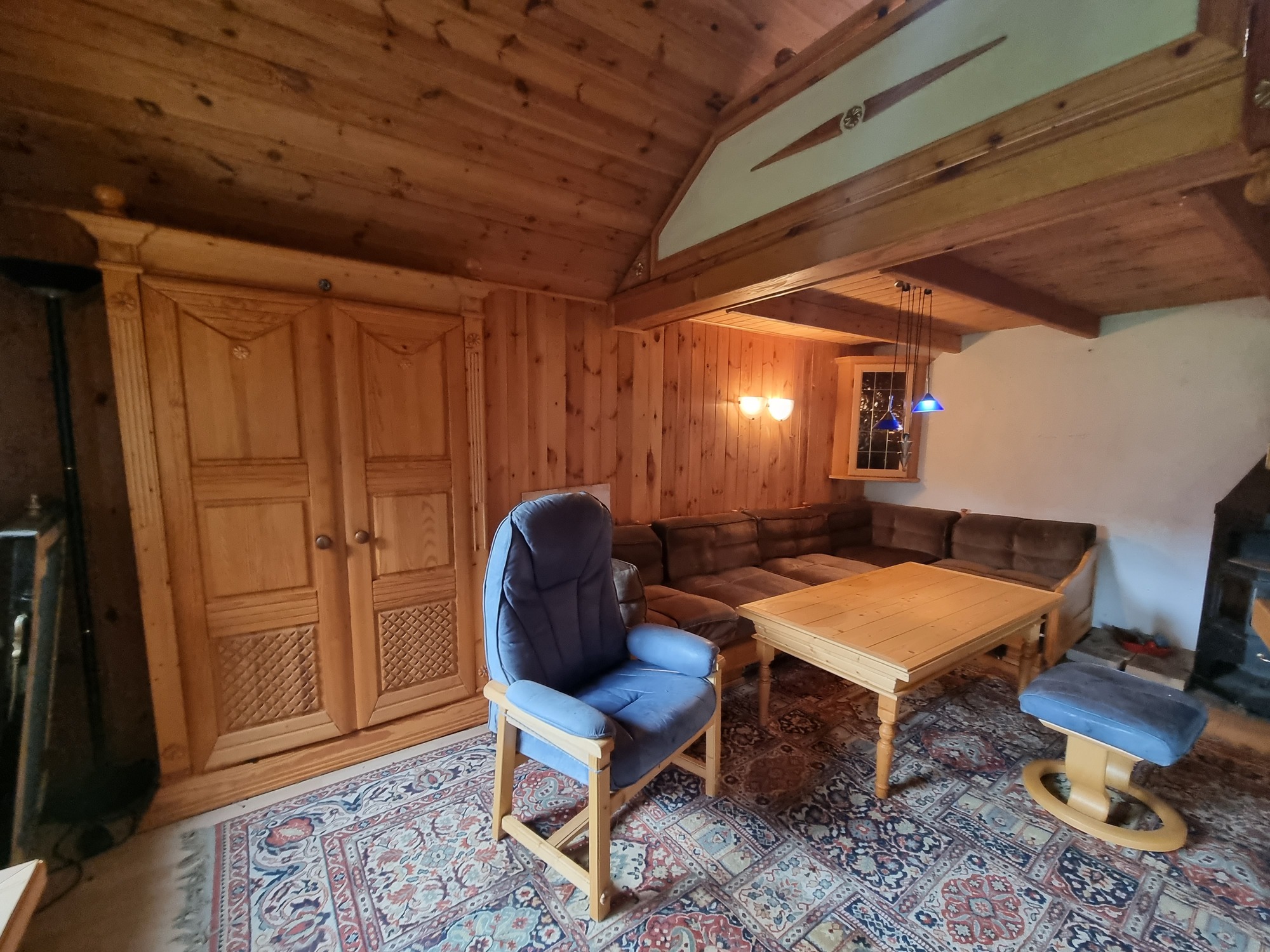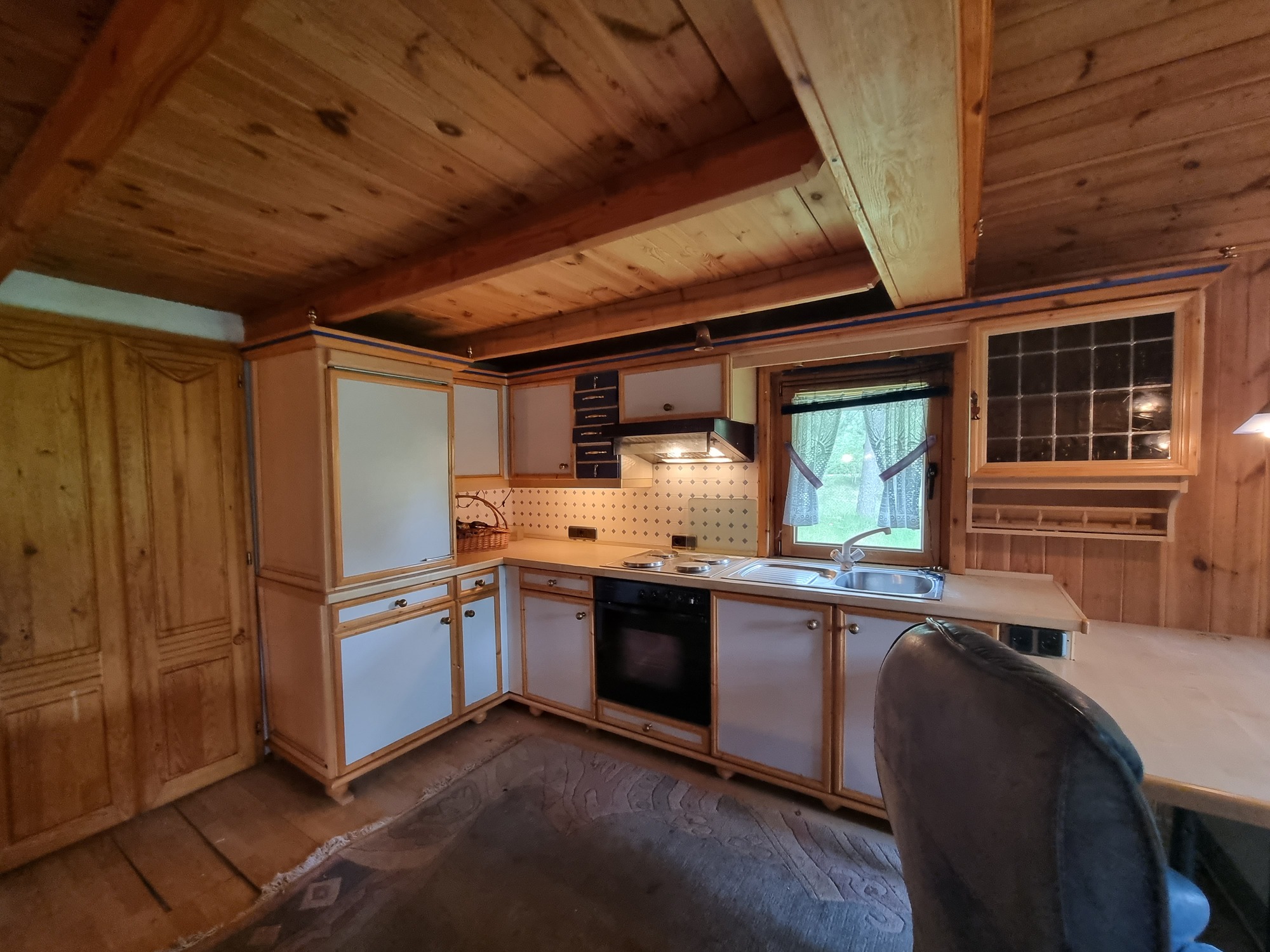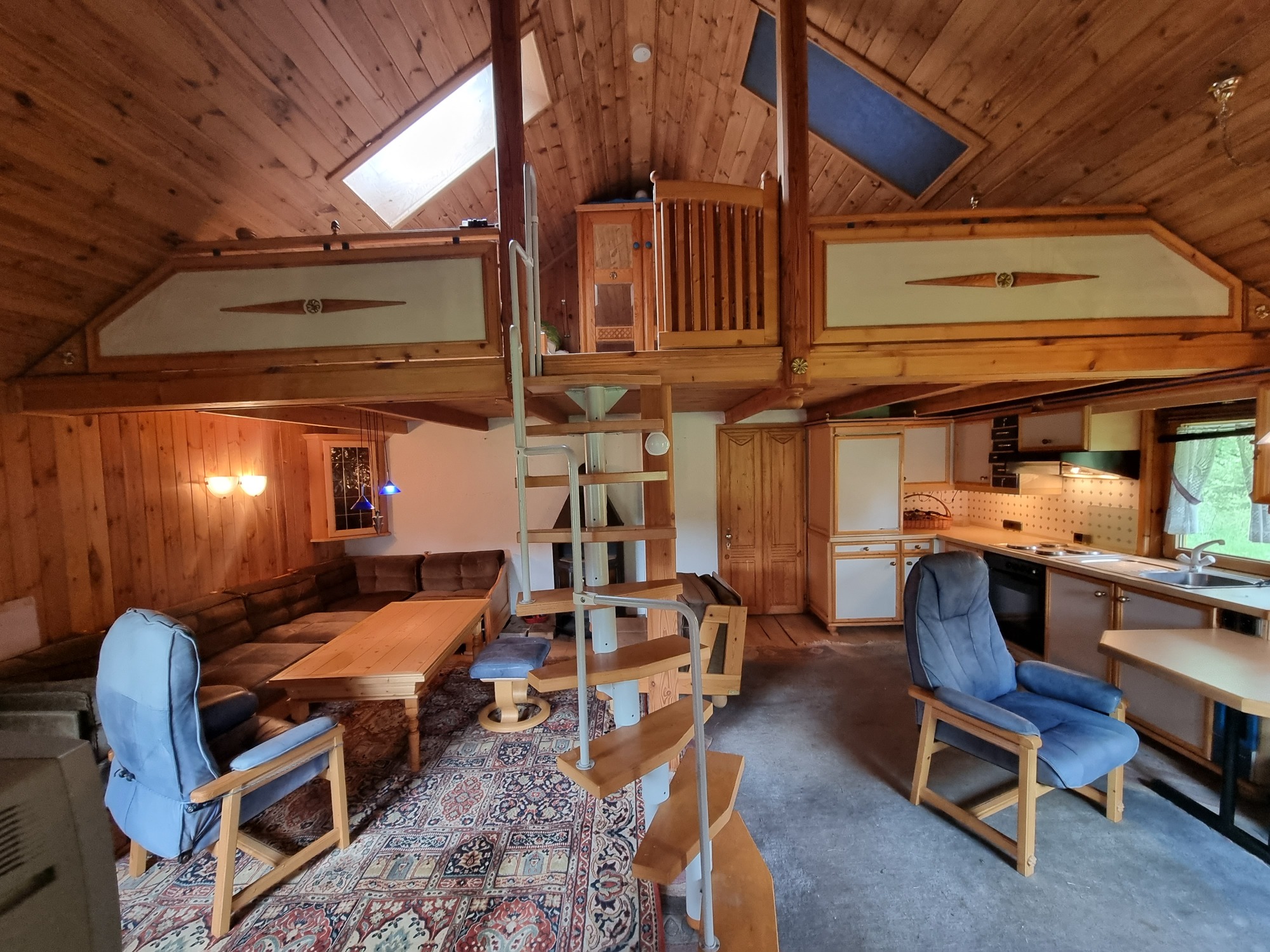 Pokój dzienny z aneksem kuchennym, w którym umiejscowiony jest kominek tworzy ciepłą i przytulną przestrzeń, znajdują się tam również schody prowadzące na antresolę – część sypialną domu letniskowego. Na parterze znajduje się także łazienka, w której znajduje się bojler elektryczny do podgrzewania wody.