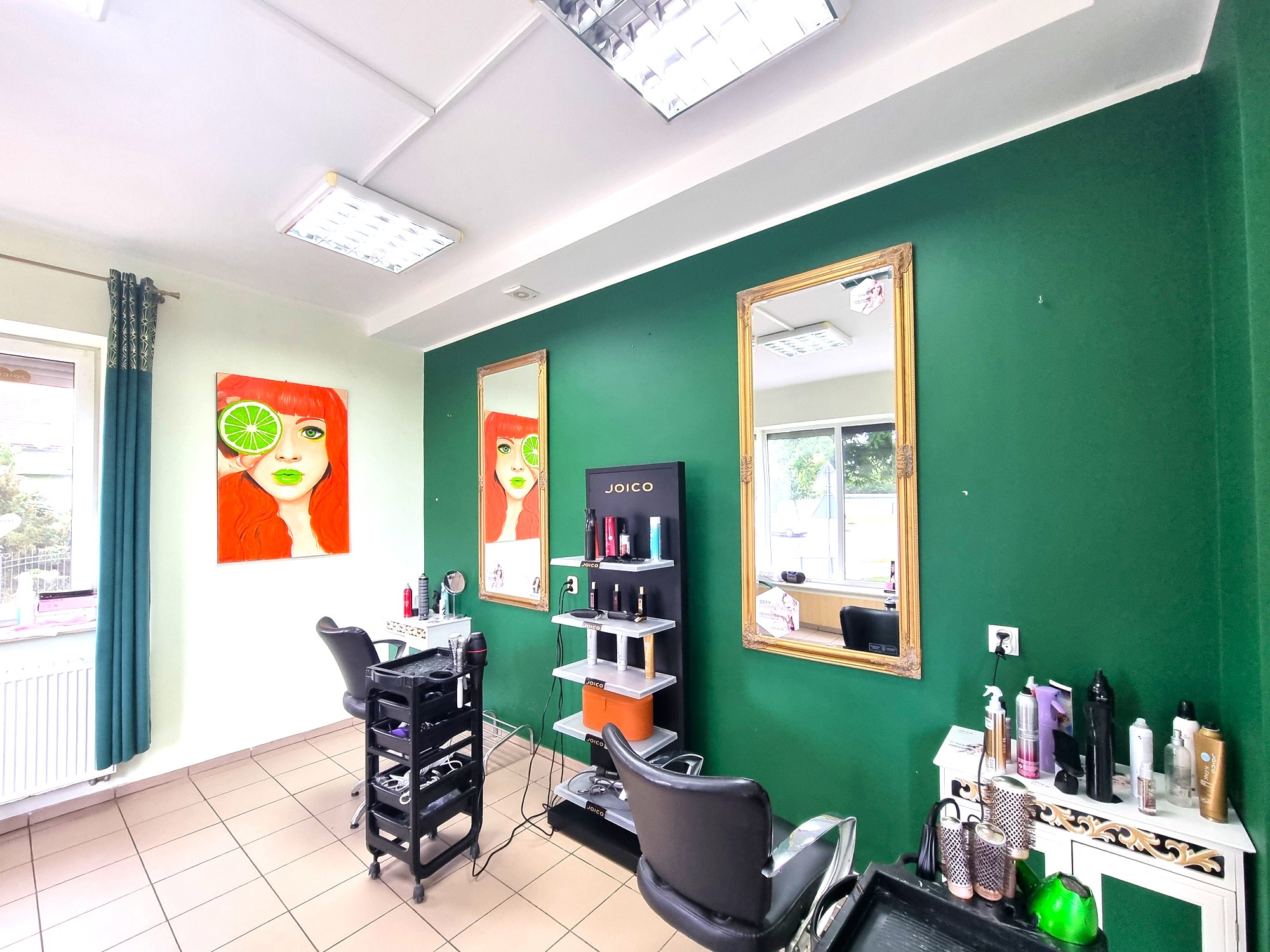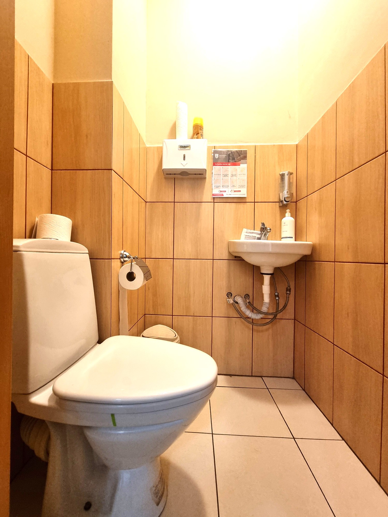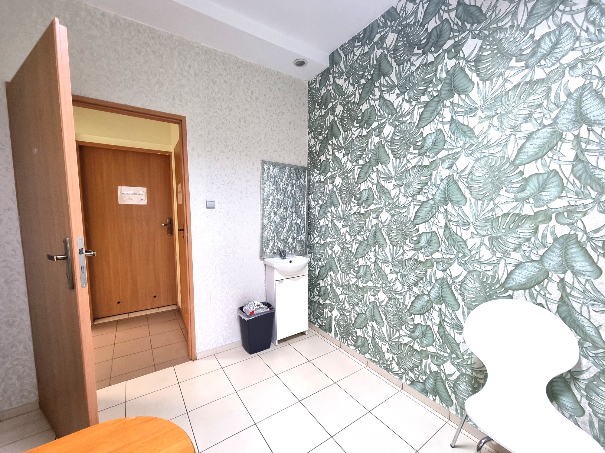 - Pomieszczenie socjalne – komfortowe zaplecze z terakotą, ozdobną tapetą, zlewem i szafką, gotowe do użytku bez konieczności dodatkowych nakładów;
