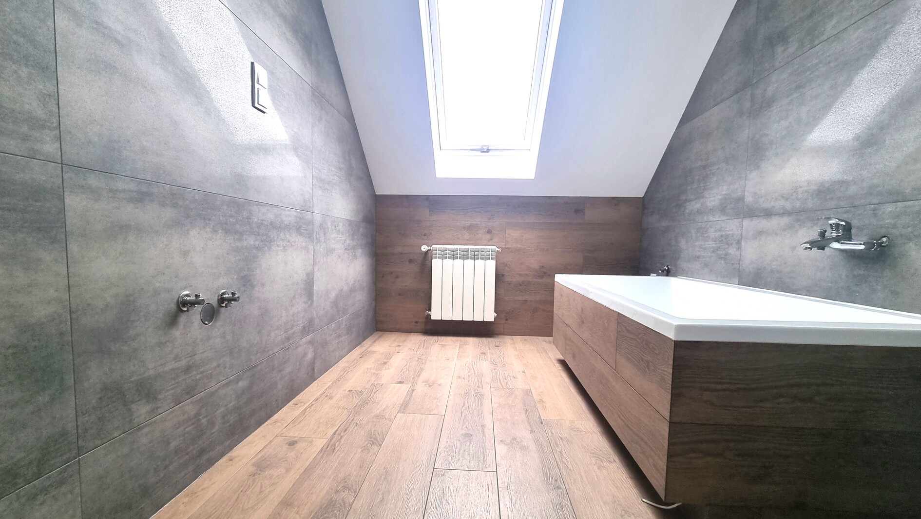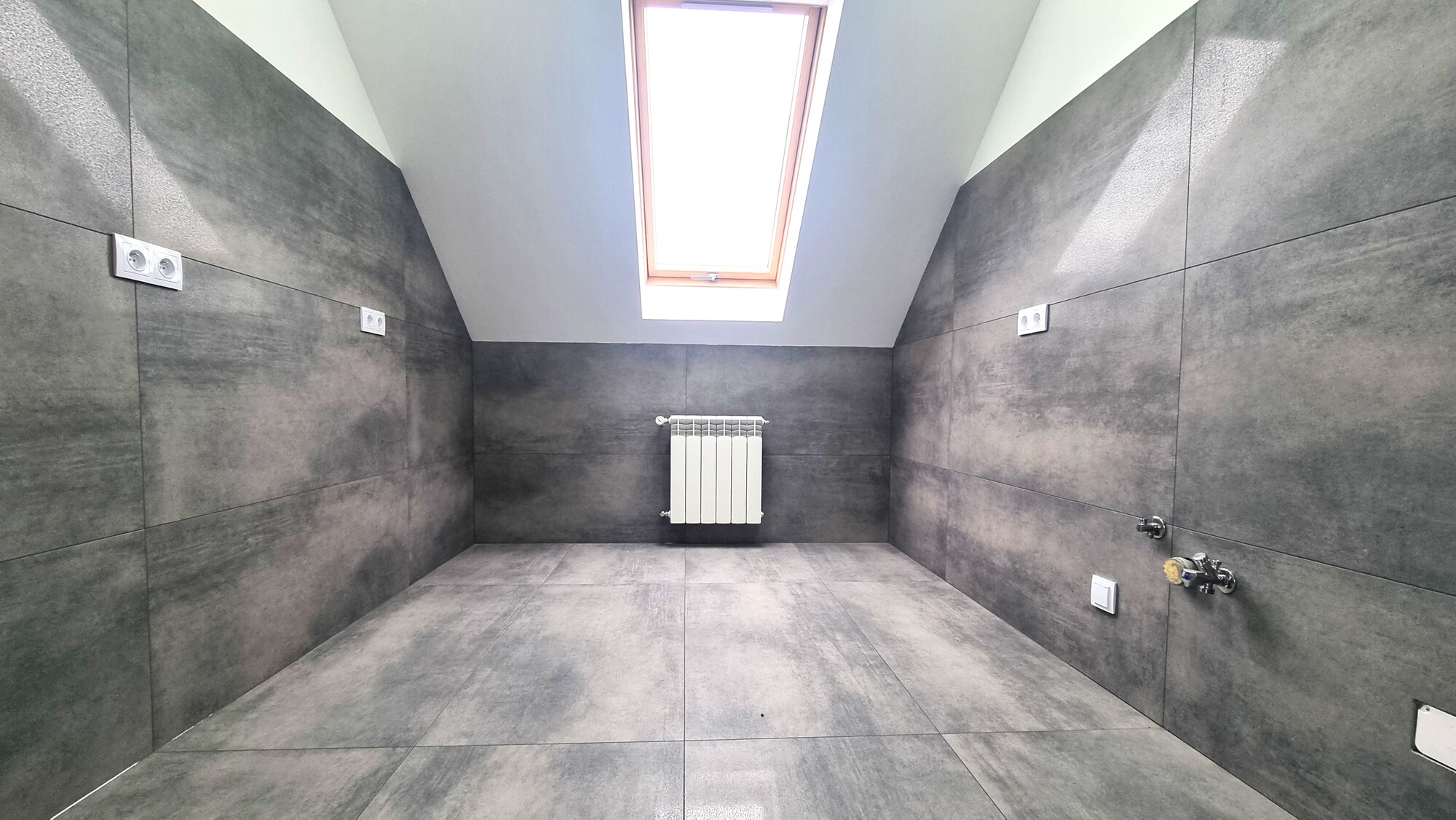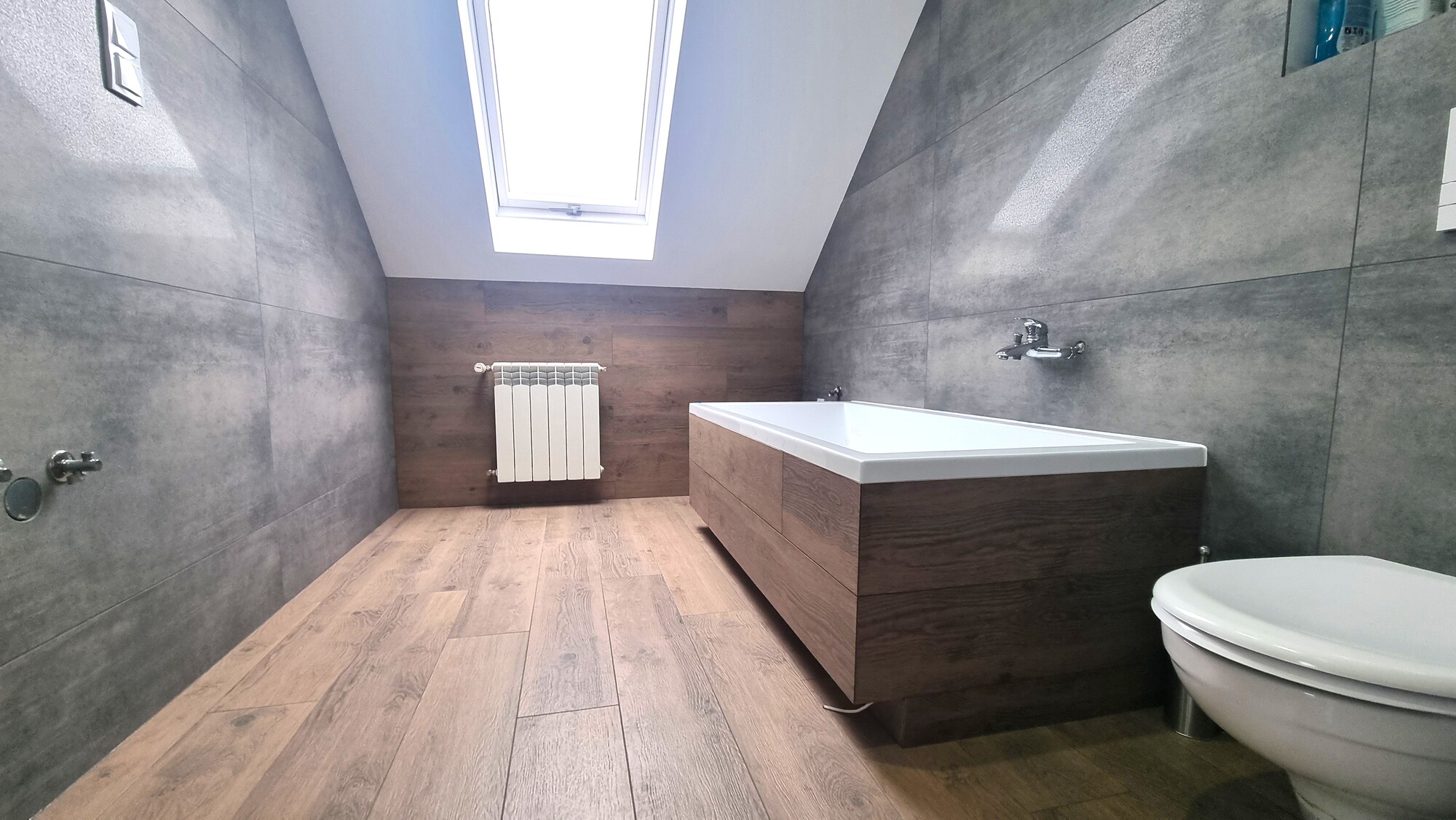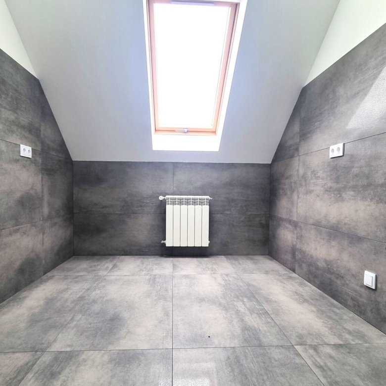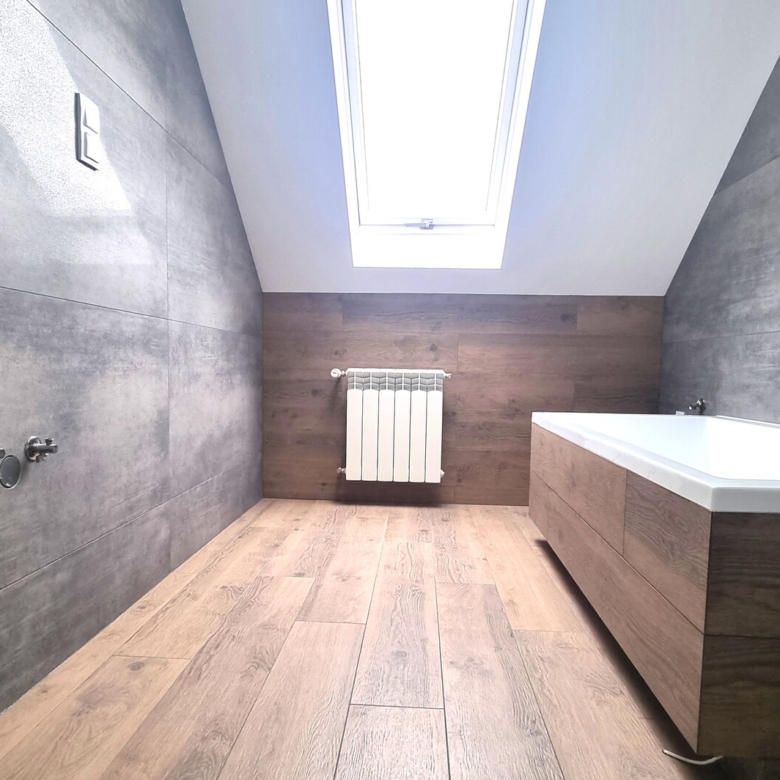 - łazienka z WC i oknem – wykończona w nowoczesnych kaflach,
